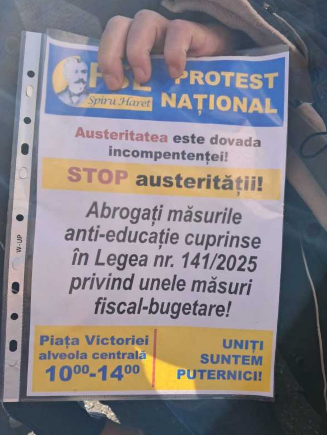 Manifestanţii scandează ‘România, trezește-te!’, ‘Demisia!’, ‘Hoții!’ şi afişează mesaje precum: ‘Nu mai acceptăm măsuri de austeritate!’, ‘Uniți negociem, separat implorăm!’, ‘Salariile stau, prețurile cresc! Poşta Română nu e test de austeritate’, ‘Cerem deblocarea imediată a angajărilor în sănătate și asistență socială’, ‘Program de lucru decent, fără epuizare!’, ‘Sanitas nu tace, Sanitas acționează!’, ‘Normativul deficitar ne sufocă!’.