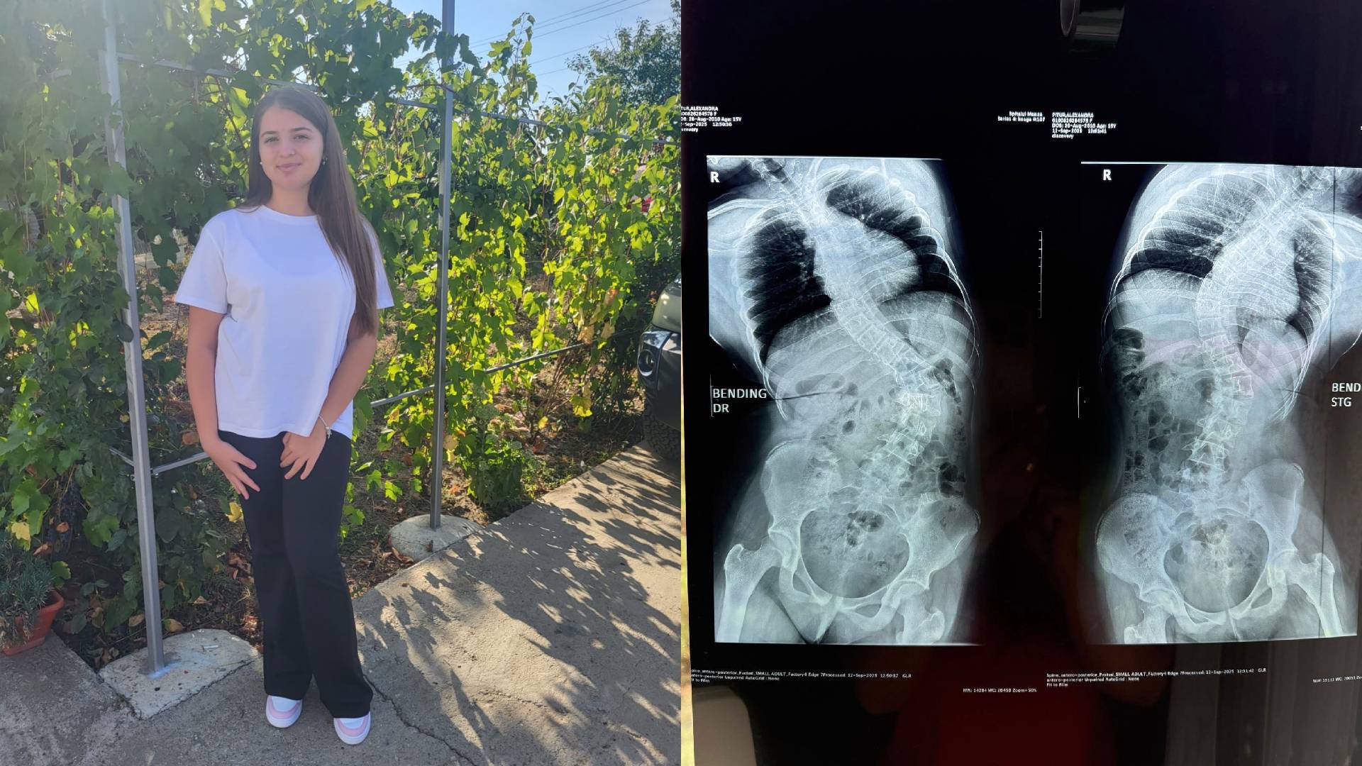 Eleva are 15 ani, originară din comuna Bălteni, a fost diagnosticată cu scolioză lombară severă, coloana sa având o curbură de 82 de grade, iar acest lucru înseamnă că, uneori, aerul nu mai ajunge în plămâni.