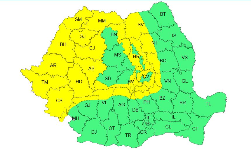Iar Codul galben este valabil tot de luni, la ora 12:00, și până în dimineața zilei de marți, 18 noiembrie, la ora 06:00, fenomenele anunțate fiind intensificări ale vântului.