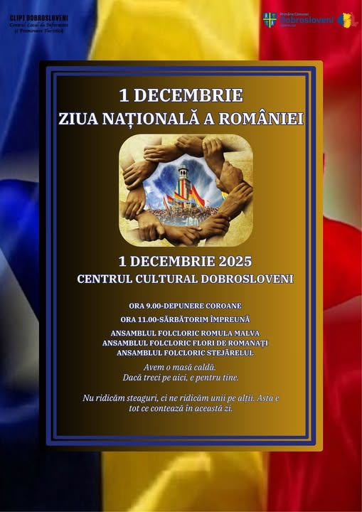 „De Ziua Națională a României, vă invităm să ne adunăm la Centrul Cultural Dobrosloveni pentru o sărbătoare trăită împreună, cu oameni dragi și tradiții care ne țin aproape. Pe 1 Decembrie 2025, începem dimineața la ora 9:00 cu depunerea de coroane, un moment de respect și recunoștință pentru cei care au scris istoria acestei țări. De la ora 11:00, atmosfera prinde viață prin energia ansamblurilor folclorice care duc mai departe sufletul zonei noastre: «Romula Malva», coordonat de coregraful Vivi Anghel, «Plai de Romanați», sub îndrumarea coregrafului Cristi Velea, «Stejărelul» din comuna Mărunței, condus de coregraful Constantin Strejescu, coordonator artistic al ansamblului fiind Mădălina Militaru. După dansuri, muzică și emoția întâlnirii cu tradiția, vă așteptăm cu o masă caldă, faimoasa fasole cu ciolan, gătită ca acasă, pentru că nimic nu apropie oamenii mai bine decât bucuria de a sta la aceeași masă. E o zi în care ne amintim cine suntem, dar mai ales că suntem împreună. Vă așteptăm cu drag să sărbătorim România în cel mai firesc și frumos mod: cu oameni, cu povești, cu energie bună și cu tradiții care ne unesc”, este invitația adresată de primarul Gheorghe Tudorașcu la sărbătoarea de pe 1 Decembrie dedicată Zilei României.