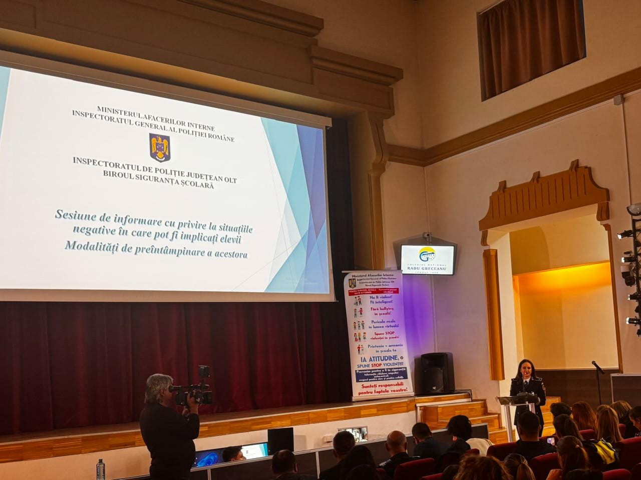 Polițiștii Biroului Siguranța Școlară, din cadrul Inspectoratului de Poliție Județean Olt, împreună cu ce ai Compartimentului de Analiză și Prevenire a Criminalității, în parteneriat cu jandarmi ai Inspectoratuiui de Jandarmi Județean Olt și reprezentanți ai Inspectoratului Școlar Județean Olt, Spitalul de Psihiatrie Cronici Schitu Greci, Centrul Județean de Resurse și de Asistență Socială Educațională, Direcția de Sănătate Publică, Direcția Generală de Asistență Socială și Protecția Copilului, Consiliul Județean al Elevilor Olt au desfășurat în după-amiaza zilei de joi, 27 noiembrie 2025, o sesiune de informare a părinților și persoanelor care au atribuții de educare a minorilor cu privire la situațiile negative în care pot fi implicați minorii și recomandări de preîntampinare a acestora, la amfiteatrul Colegiului Național „Radu Greceanu” din municipiul Slatina.