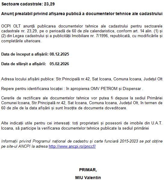Anunț prealabil privind afișarea publică a documentelor tehnice ale cadastrului