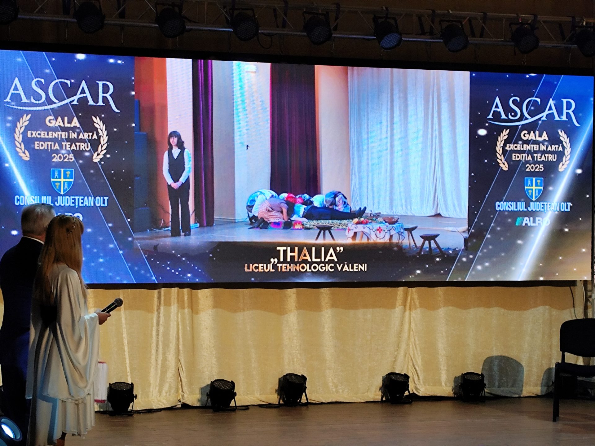 Marian Năstase, președintele Consiliului de Administrație ALRO, prezent, de asemenea, la eveniment, a spus: „Am venit astăzi, aici, cu gânduri de bucurie. Suntem în luna cadourilor, suntem în luna lui Moș Crăciun, suntem la un sfârșit de an fără zăpadă, dar, din fericire, avem apă, că în alte județe am văzut că nu e apă. Mă bucur foarte mult, continuăm cu sprijinirea tinerilor artiști, mă bucur pentru această gală în care îi premiem pe cei care evoluează pe scena teatrului. Eu cred că sunt șanse care se dau copiilor și ne bucură asta. ALRO e întotdeauna alături de comunitate, după cum știți… Ne bucură parteneriatul și colaborarea foarte bună cu autoritățile locale, cu președinția Consiliului Județean, cu Consiliul Județean, care, cum să spun, întotdeauna a venit în întâmpinarea solicitărilor noastre de a face niște evenimente pentru Slatina. De ce pentru Slatina? Pentru că sunt colegii noștri din fabrică. Sunt copiii lor, sunt copiii noștri. Eu nu stau în Slatina, dar am toți colegii care au copii și, cum să spun, au și istorie, au avut părinți care au lucrat la uzină, au avut frați care au lucrat la uzină și eu sper să creștem și calitatea vieții din Slatina și din Olt, astfel încât să ne readucem copiii în țară, să ne readucem copiii în Slatina, să fie mândri că lucrează la uzină, să asigurăm niște condiții nu numai de muncă, dar și niște condiții culturale, niște condiții de viață, n-aș spune neapărat de distracție, dar omul când pleacă de la uzină vrea să facă și altceva. Și asta ne dorim: să vedem teatre de calitate, să avem piese puse în scenă frumos și, dacă putem și noi să contribuim cu ceva, o facem cu cea mai mare deschidere și plăcere”.