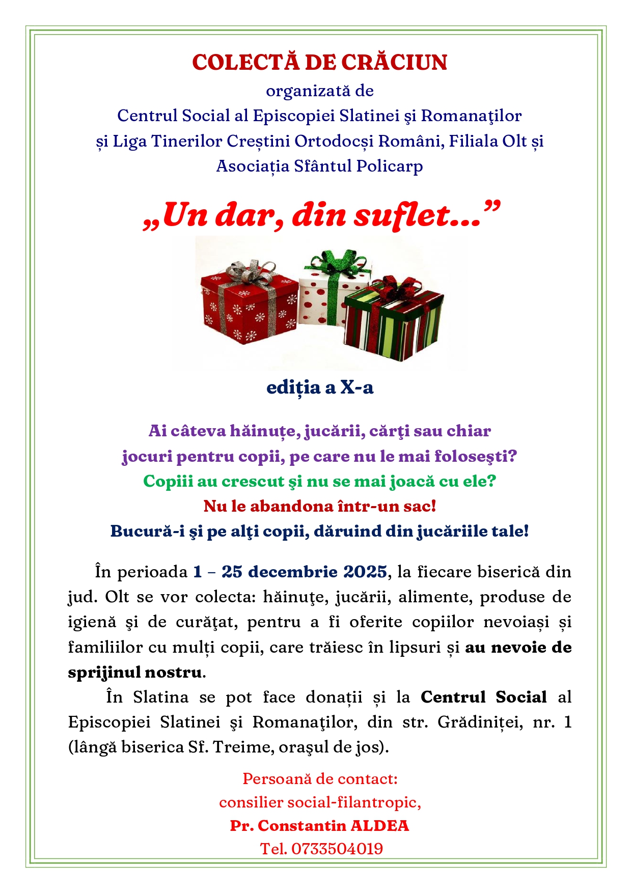 Pentru a veni în sprijinul copiilor și persoanelor nevoiașe, Centrul Social din cadrul Episcopiei Slatinei și Romanaților, Liga Tinerilor Creştini Ortodocși Români, Filiala Olt, și Asociația Sfântul Policarp organizează, în perioada 1 – 25 decembrie 2025, ediția cu numărul X a Campaniei de Crăciun „Un dar, din suflet…”, care se va desfășura în toate parohiile eparhiei.