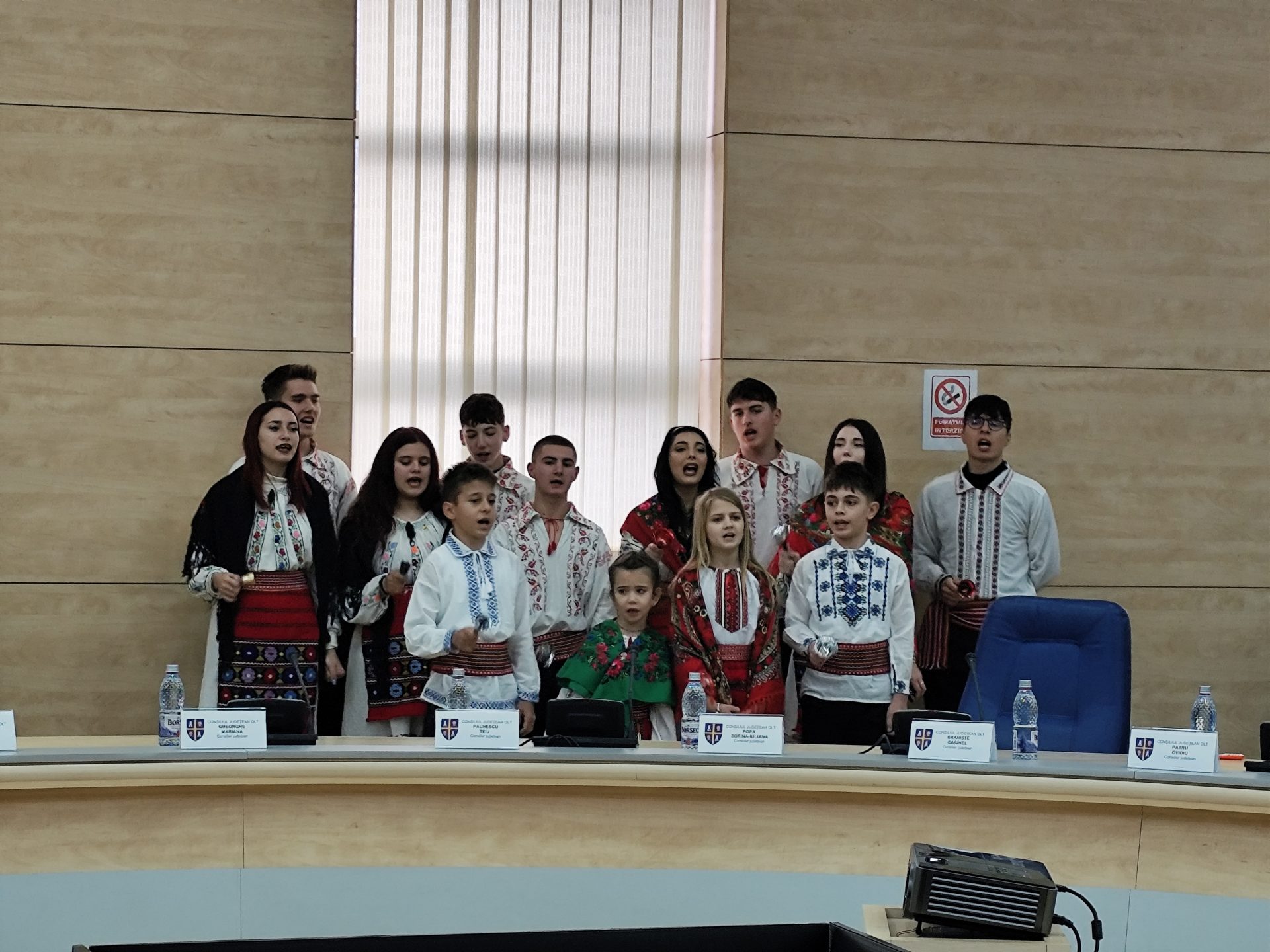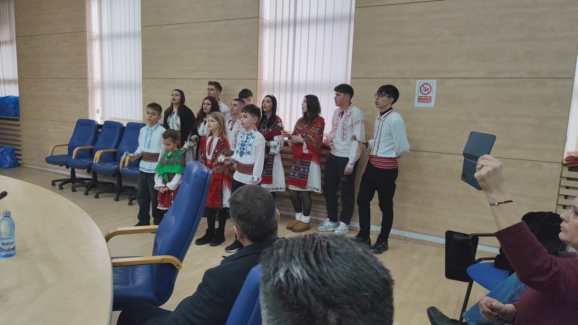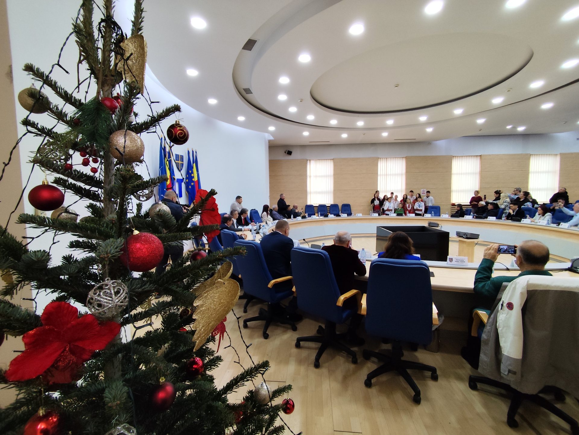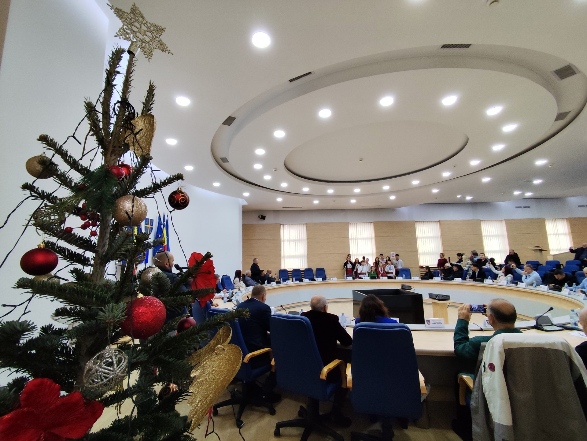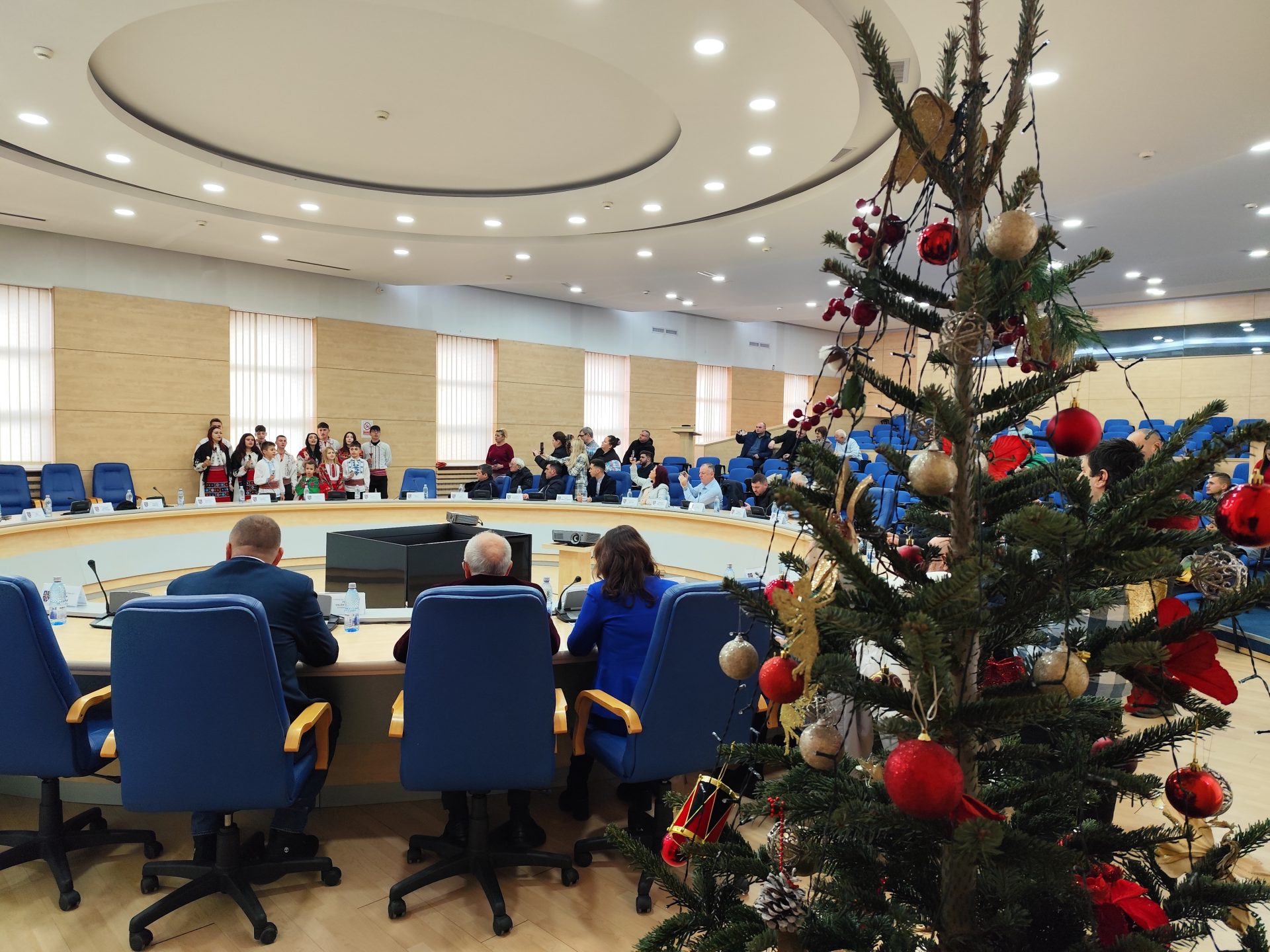 Consilierii județeni au avut parte de o surpriză joi, 18 decembrie, înainte de începerea ultimei ședințe ordinare din anul 2025. Aleșii au fost colindați de un grup vocal de fete și băieți, care la finalul micului spectacol au primit cadouri de la mesagerii lui Moș Crăciun.