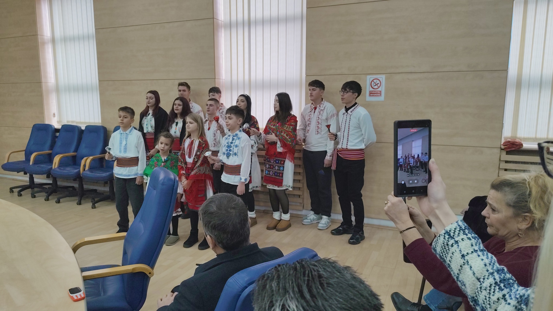 Peste zece colindători din cadrul Ansamblului Folcloric „Cununa” din comuna Șopârlița au prezentat un scurt program artistic a cappella de colinde autentice românești. La final, momentul oferit de colindători a fost îndelung aplaudat de Marius Oprescu, președintele Consiliului Județean Olt, cei doi vicepreședinți ai celei mai importante instituții administrative din județ, Virgil Delureanu și Ionuț Ivan, cât și de consilierii județeni prezenți în Sala Europa a CJ.