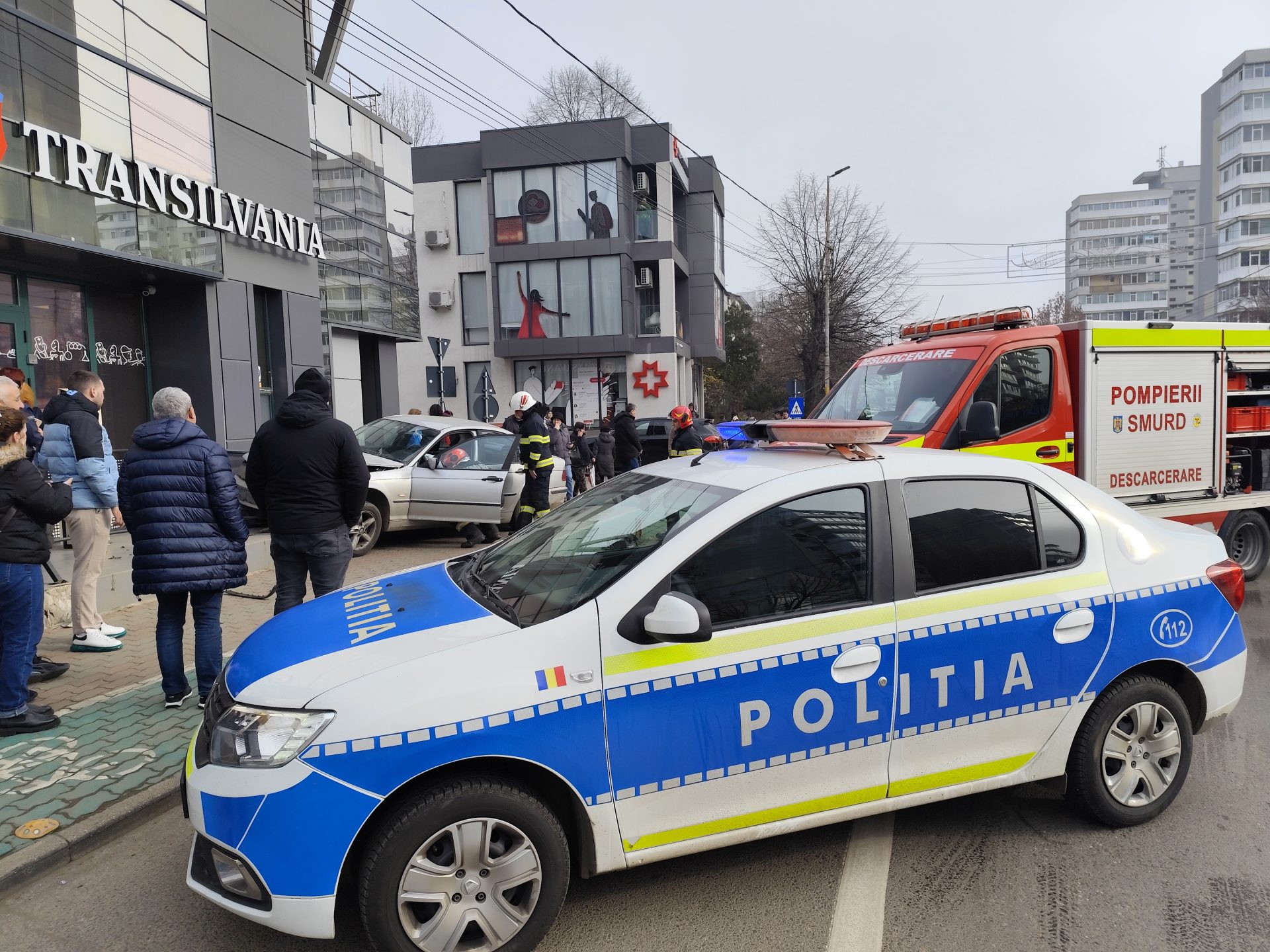 Accidentul putea avea urmări grave, având în vedere că una dintre mașini a ajuns pe trotuar, apoi în rampa unității bancare.