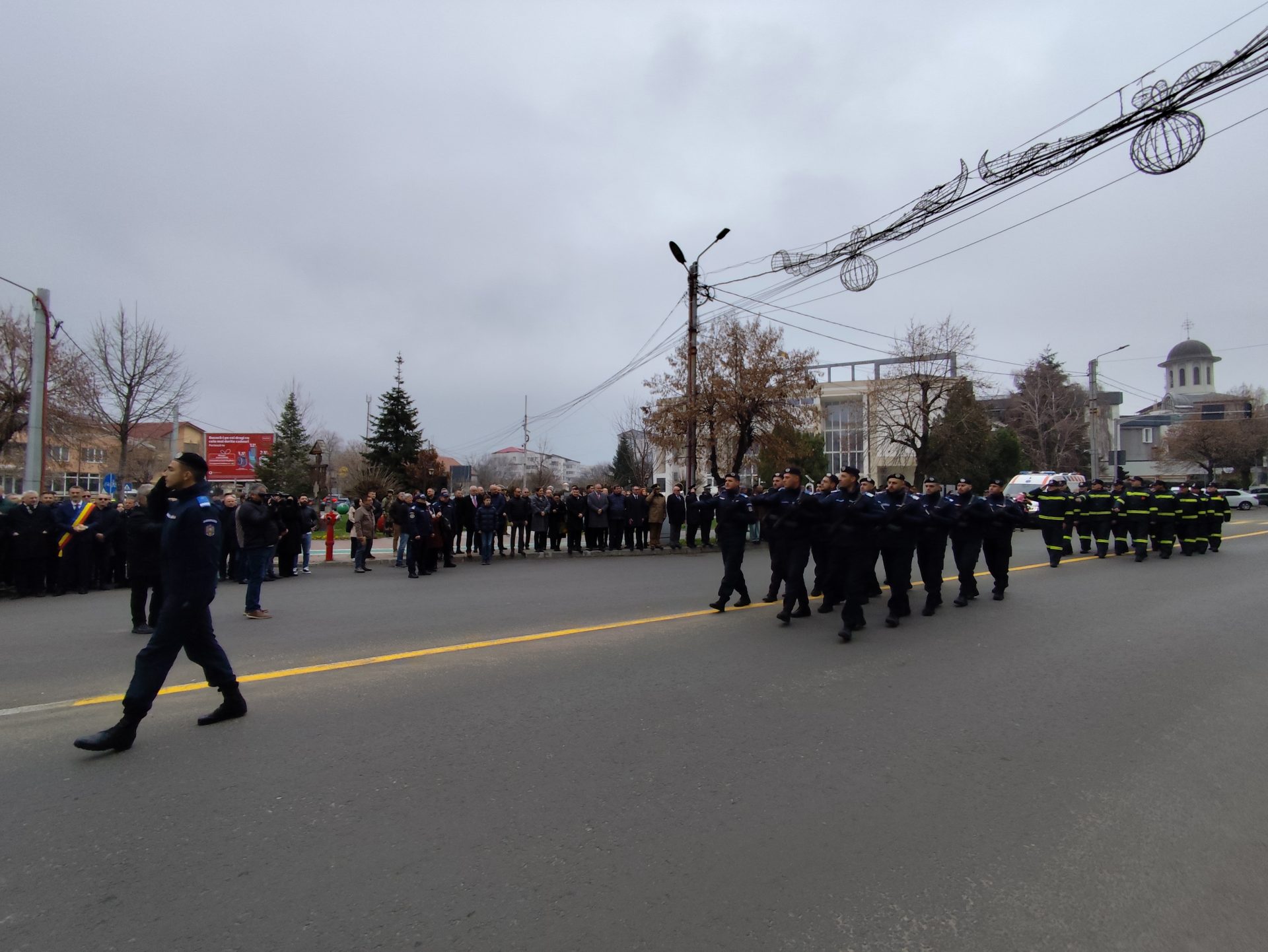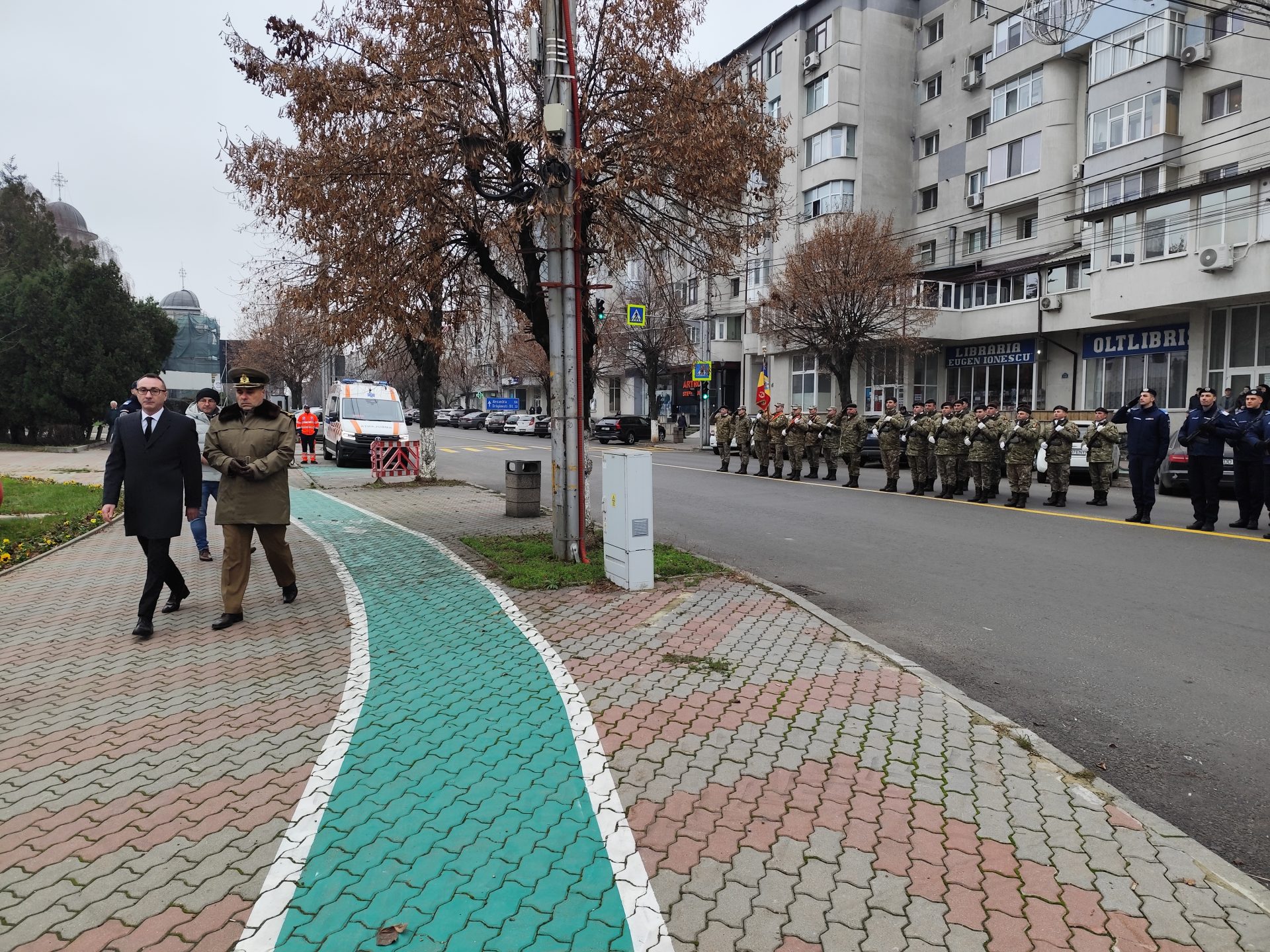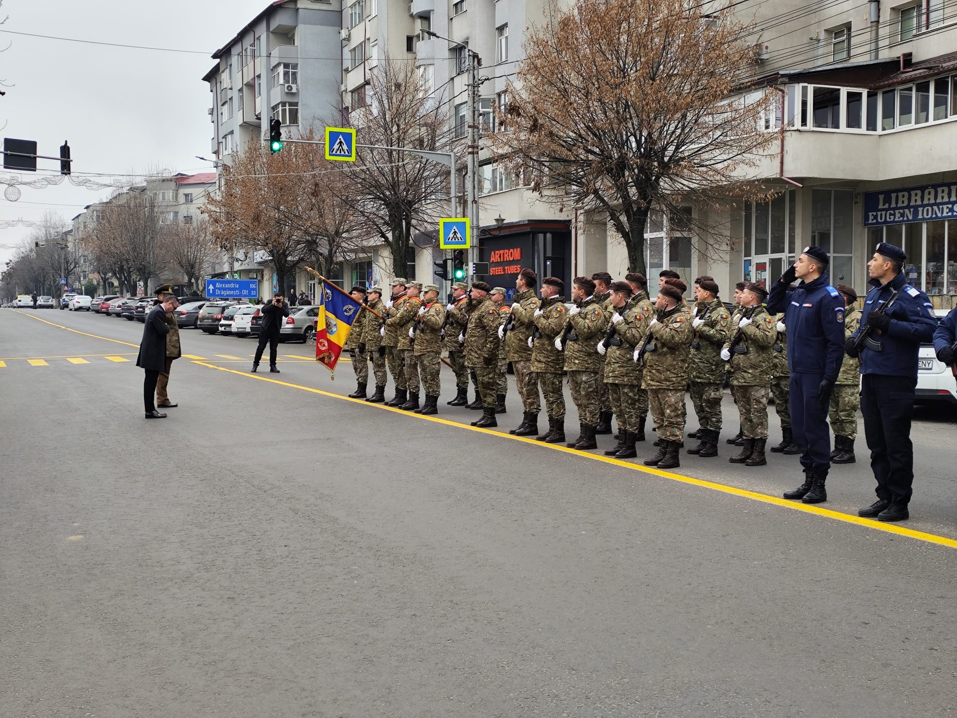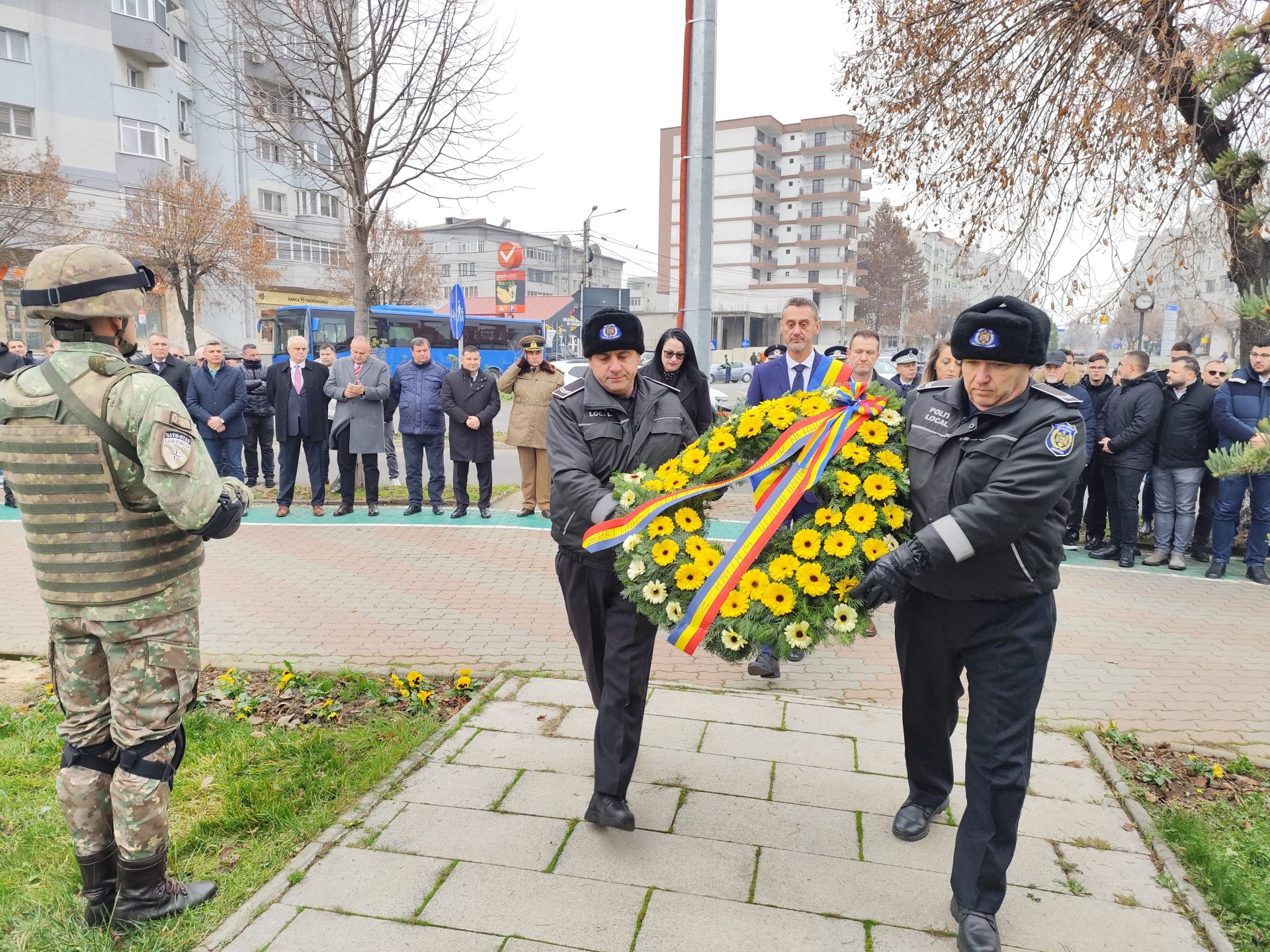 Pe imnul Eroilor, manifestarea a continuat apoi cu depunerea de coroane de flori la troiță, pentru a-i omagia pe martirii din revoluţiei din Decembrie ’89, dar și cu defilarea gărzii de onoare alcătuită din militari ai Batalionului 22 Infanterie „Romanați” din municipiul Caracal, efective ale Jandarmeriei Olt și pompieri din cadrul Inspectoratului pentru Situații de Urgență Olt.