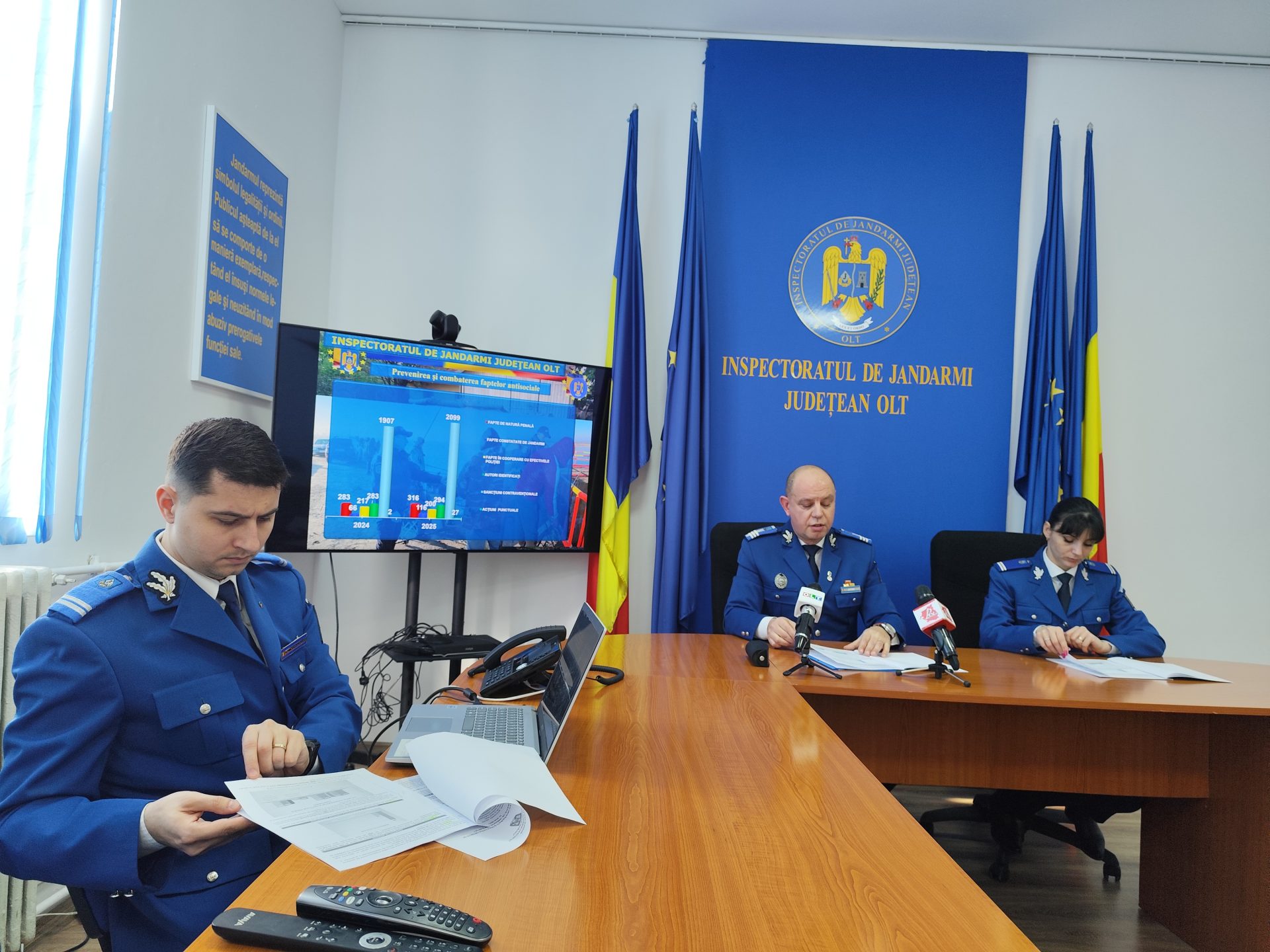 Sala de ședințe a Inspectoratului de Jandarmi Județean Olt a găzduit luni, începând cu ora 11:00, bilanțul activității instituției teritoriale a Ministerului Afacerilor Interne din anul 2025, acesta fiind prezentat de colonelul Emanuel Botan, inspectorul șef al Jandarmeriei Olt, alături de acesta fiind locotenent Mirabela Săndoiu, purtător de cuvânt al inspectoratului. Peste 9.500 a fost numai numărul patrulelor la care au participat jandarmii, însă pe parcursul anului trecut aceștia au avut cu 76 la sută mai multe misiuni de intervenție, faptele penale constatate fiind și ele îm creștere cu 11%. Oamenii legii au înregistrat aprecieri și pe alte linii de acțiune.