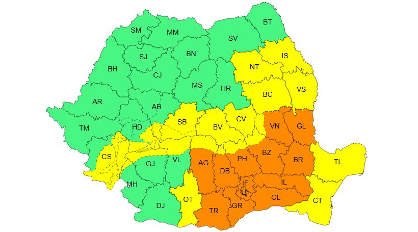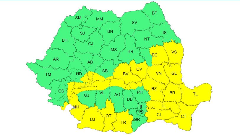 Iar miercuri, în intervalul orar 12:00 – 20:00, este valabil un Cod galben de ninsori viscolite și strat de zăpadă: „În Dobrogea, jumătatea sudică a Moldovei, estul Munteniei, sud-estul Transilvaniei și în Carpații Merdionali și de Curbură, temporar va ninge viscolit și se va depune strat de zăpadă, în medie de 10…15 cm și vizibilitatea va fi redusă sub 100 m. Vântul va avea viteze de 50…70 km, iar în zona montană înaltă rafalele vor atinge 70…90 km/h”.