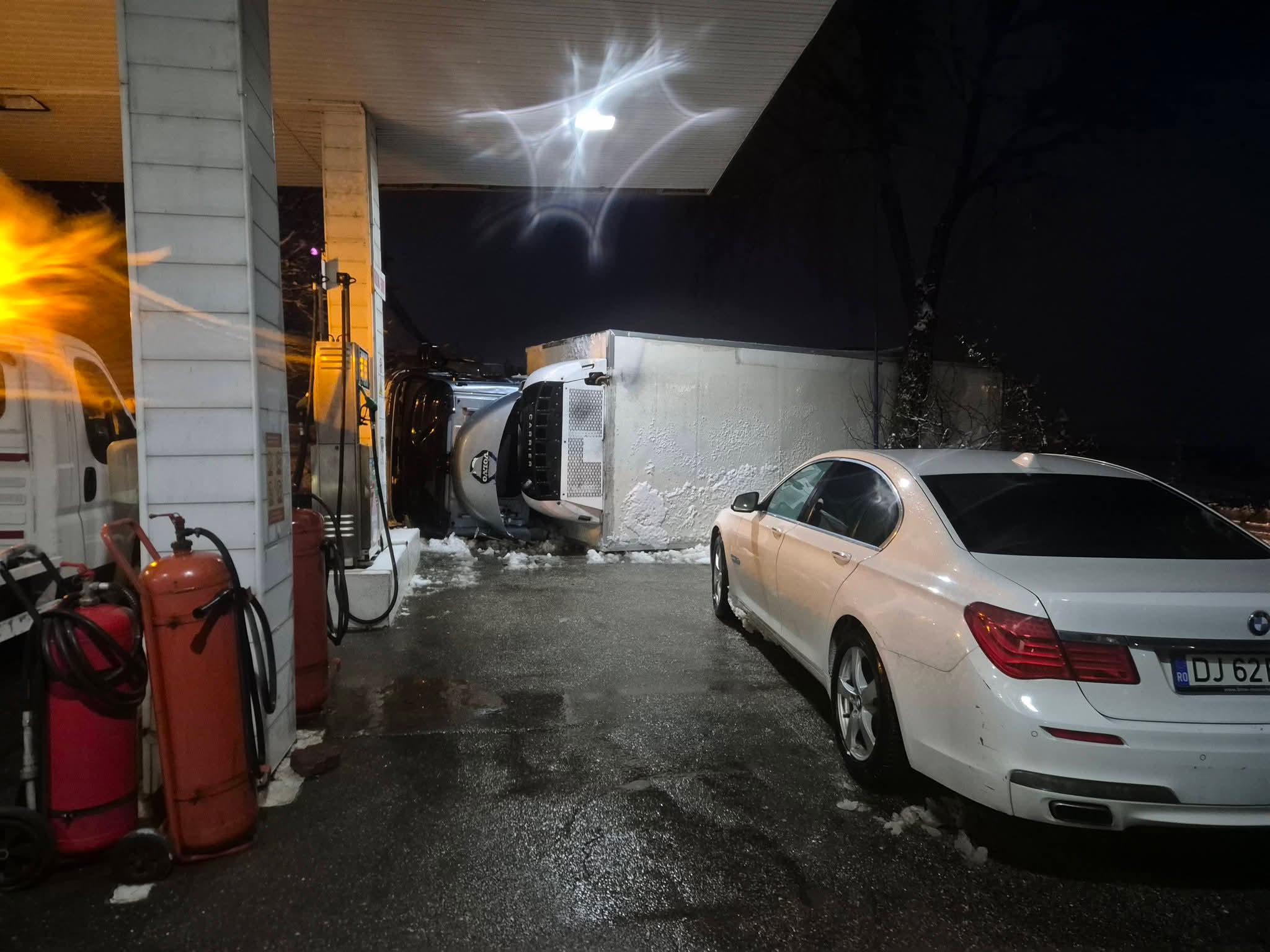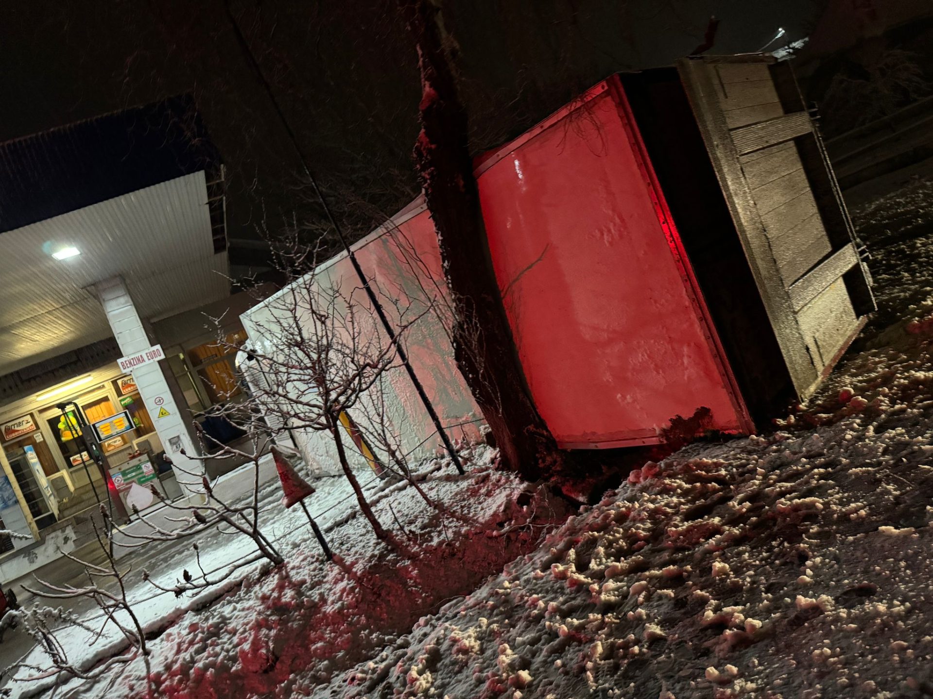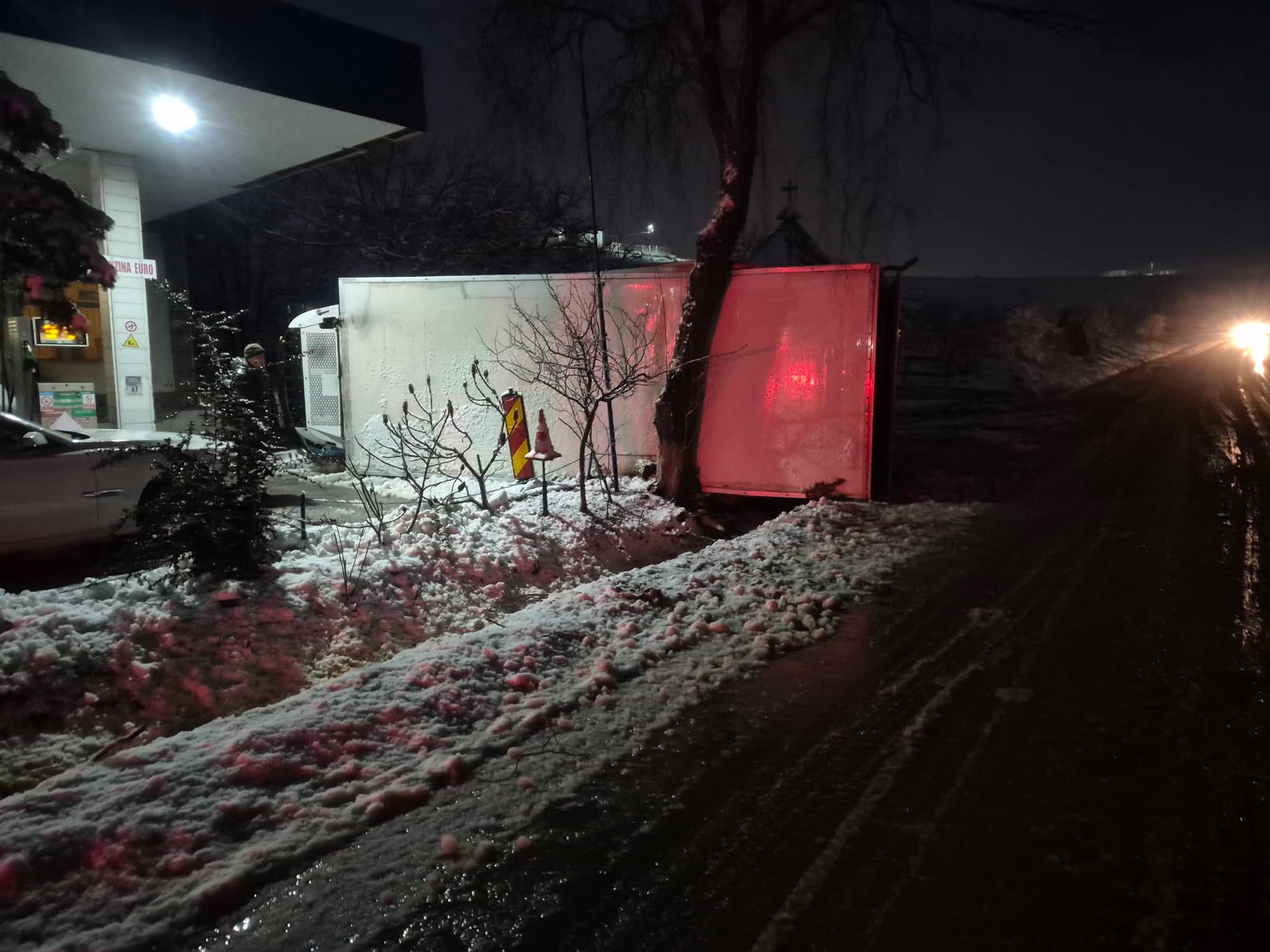 Tragedie evitată în ultimul moment. Un TIR s-a răsturanat chiar în benzinăria de la intrarea în comuna Brebeni
