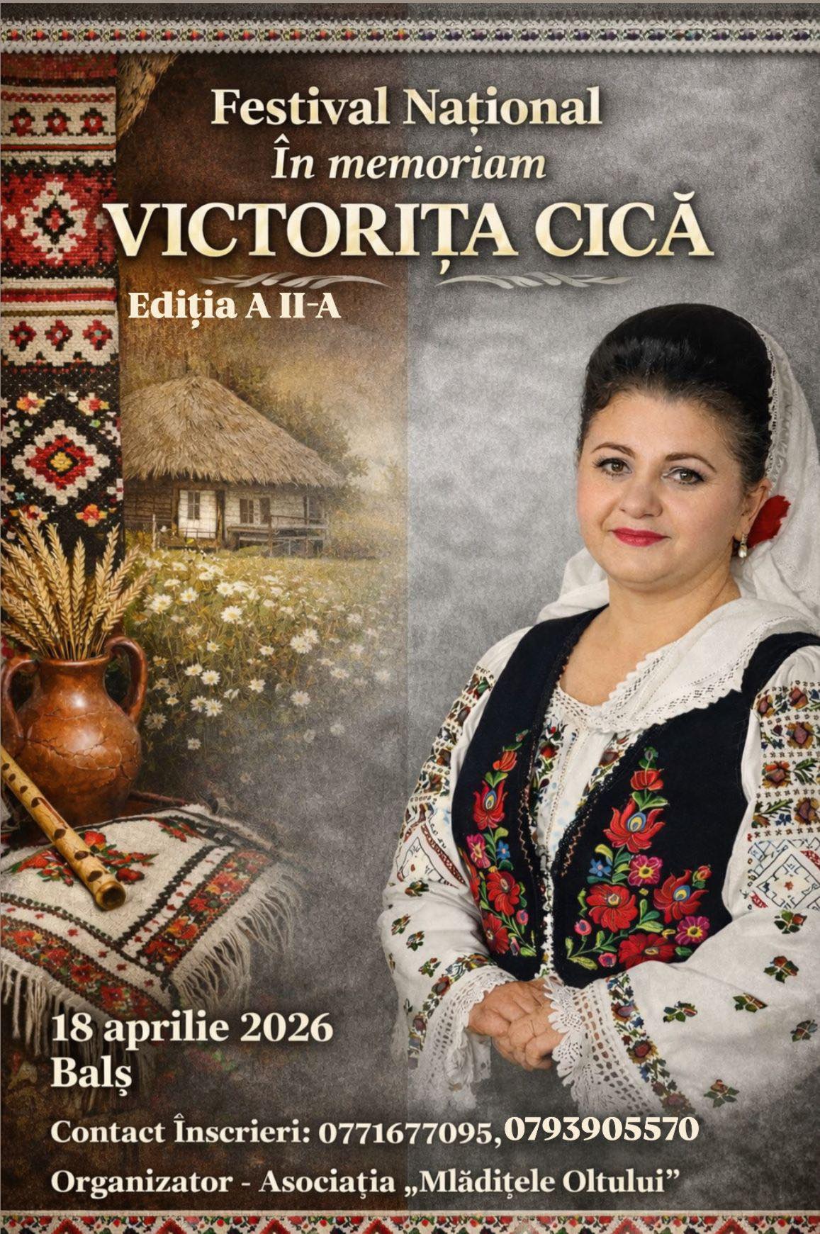 În urmă cu doi ani, la început de lună februarie, trecea în neființă la vârsta de doar de 50 de ani. Victorița Cică, solistă vocală în cadrul Ansamblului Folcloric „Doina Oltului” Slatina, din cadrul Centrului Județean de Cultură și Artă Olt, instituție din subordinea Consiliului Județean Olt, căci despre este vorba, are de anul trecut un festival national de folclor care îi este dedicat. Festivalul „In Memoriam Victorița Cică” a ajuns deja la ediția a II-a, în anul 2026 acesta desfășurându-se tot în orașul Balș, sâmbătă, 18 aprilie, chiar la câteva zile după Sfânta Sărbătoare a Paștelui, în Săptămâna Luminată, de organizarea sa ocupându-se Cătălin Florin Puchină, soțul artistei, și Asociația „Mlădițele Oltului”.