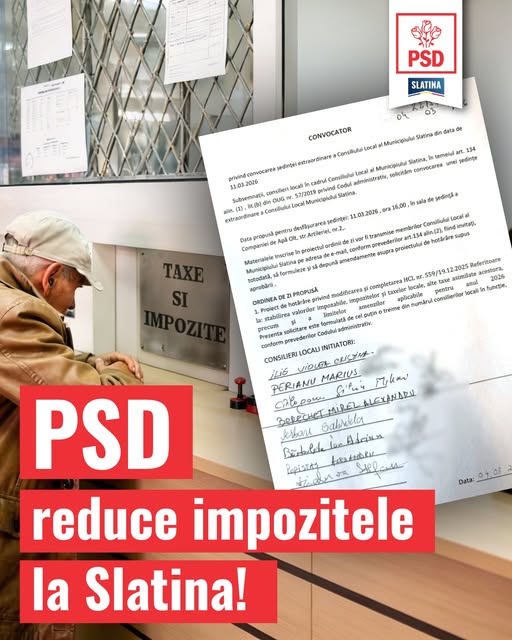 „Consilierii locali PSD au convocat o ședință extraordinară a Consiliului Local și au depus un proiect pentru reducerea taxelor și impozitelor din municipiul Slatina. Primarul De Mezzo impusese majorarea taxelor pentru slătineni, prin votarea în mod abuziv a unor amendamente, în cadrul ședinței din decembrie 2025. Prin Ordonanța de Urgență nr. 9/2026 a Executivului, de vineri (27 februarie n.r.), autoritățile locale au posibilitatea legală de a revizui în sensul reducerii cotelor adiționale la impozitele și taxele locale stabilite anterior pentru anul 2026”, se arată într-o postare pe pagina oficială de Facebook a PSD Slatina.