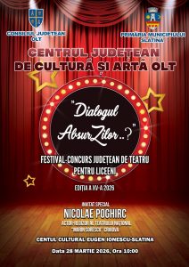 Centrul Județean de Cultură și Artă Olt, instituție aflată în subordinea Consiliul Județean Olt, anunță că sâmbătă, 28 martie 2026, începând cu ora 10.00, se desfășoară cea de-a XV-a ediție a Festivalului concurs județean de teatru pentru liceeni „Dialogul AbsurZilor”.