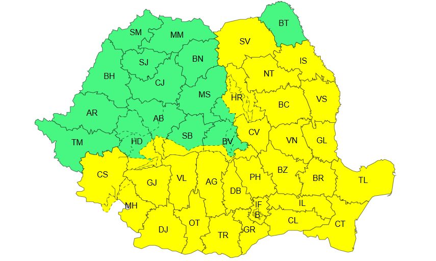 Primul Cod galben este valabil în același interval de timp, fiind anunțate precipitații însemnate cantitativ, la munte, la altitudini mai mari de 1.600 metri, ninsori, strat de zăpadă și viscol.