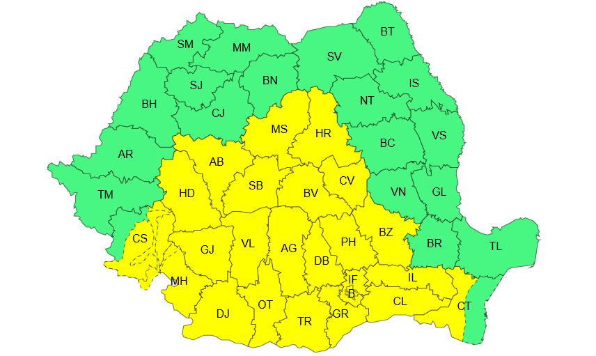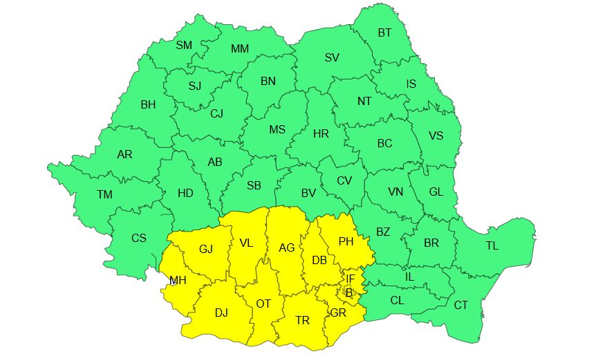Primul dintre ele este în vigoare vineri, între orele 10:00 – 22:00, în sudul Banatului, Oltenia, cea mai mare parte a Munteniei și Transilvaniei și sud-vestul Dobrogei: „În intervalul menționat, în sudul Banatului, Oltenia, cea mai mare parte a Munteniei și Transilvaniei și în sud-vestul Dobrogei vântul va avea intensificări cu viteze de 50…70 km/h, iar la altitudini mari în vestul Carpaților Meridionali rafalele vor atinge 90…100 km/h”.