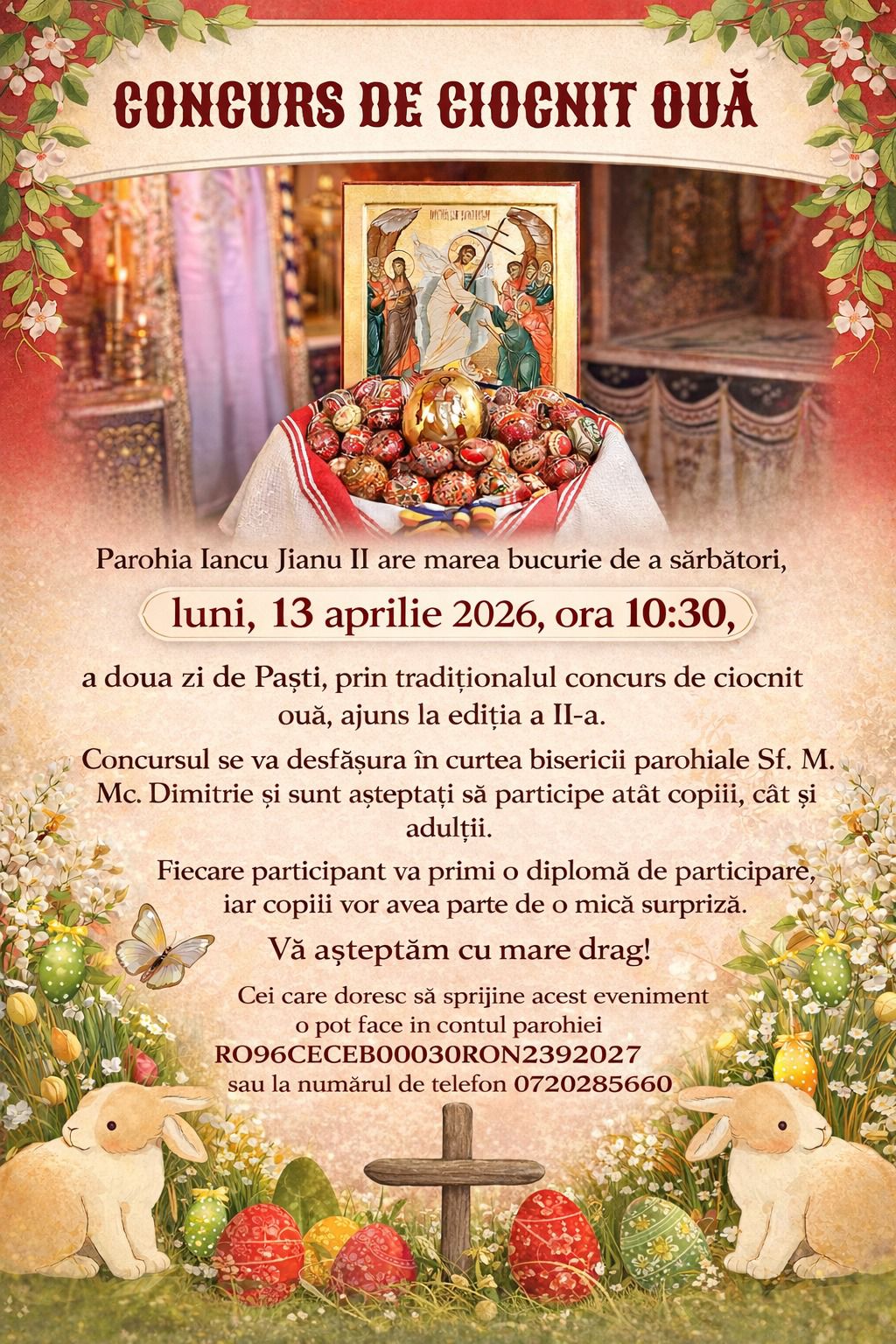 Parohia Iancu Jianu II organizează luni, 13 aprilie 2026, a doua zi de Paște, cu începere de la ora 10:30, tradiționalul concurs de ciocnit ouă, care este la ediția a II-a.