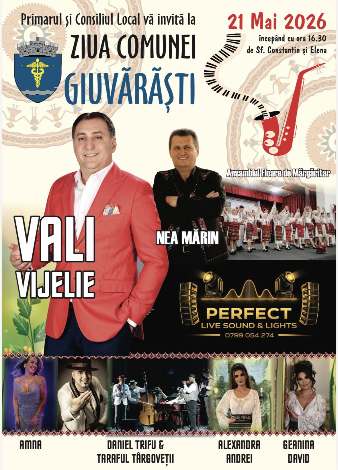 21 mai este o zi cu dublă semnificație pentru locuitorii comunei Giuvărăști. Pe lângă marea sărbătoare a Sfinților Împărați Constantin și Elena, aici are loc Ziua localității Giuvărăști, unde invitații de seamă ai primarului Daniel Pană vor fi artiști de marcă ai muzicii populare și lăutărești, cap de afiș fiind Vali Vijelie și nu doar el, având în vedere că pe scena evenimentului va urca și maestrul coregraf Marin Barbu, cunoscut de mulți Nea Mărin, cel care este amfitrion al cunoscutei emisiuni „Poftiți pe la noi” de la Antena 1. Edilul, împreună cu echipa sa din Primăria și Consiliul Local, au pregătit în amănunt acest eveniment de anvergură care va avea loc joi, 21 mai, începând cu ora 16:00 a după-amiezii, în centrul localității.