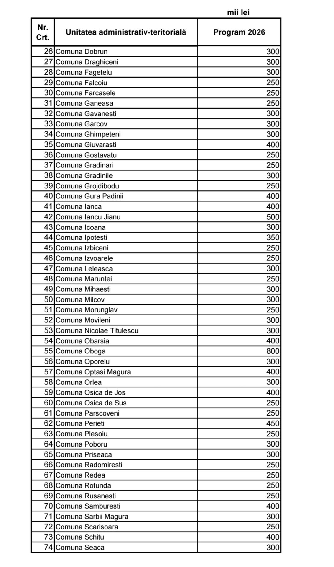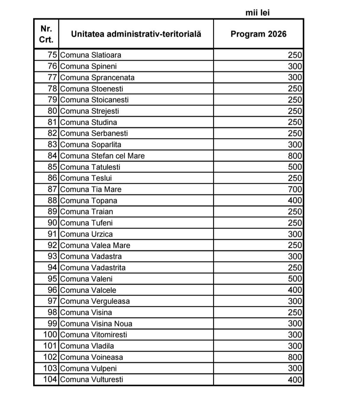 Iar în privința finanțării cheltuielilor pentru drumurile județene și comunale, suma alocată pentru anul 2026 este de peste 24,5 milioane de lei.