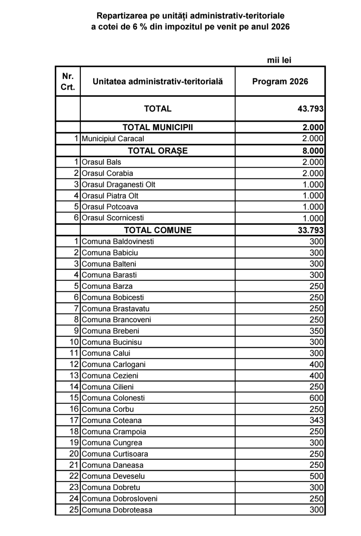 111 dintr-un total de 112 primării primesc bani, respectiv cota de 6 la sută din impozitul pe venit pe anul trecut, aproximativ 43,8 milioane de lei. Majoritatea UAT-urilor au primit sume cuprinse între 250.000 și 400.000 de lei, însă au existat și primărilor cărora CJ Olt le-a alocat fonduri mai mari, cum ar fi Oboga, Ștefan cel Mare și Văleni – câte 800.000 de lei fiecare, câte 2 milioane lei pentru UAT Caracal, Balș, Corabia și câte un milion de lei pentru primăriile Drăgănești Olt, Piatra Olt, Potcoava și Scornicești. Doar Unitatea Administrativ Teritorială nu a primit niciun ban care urmare a aprobării acestui proiect de hotărâre.